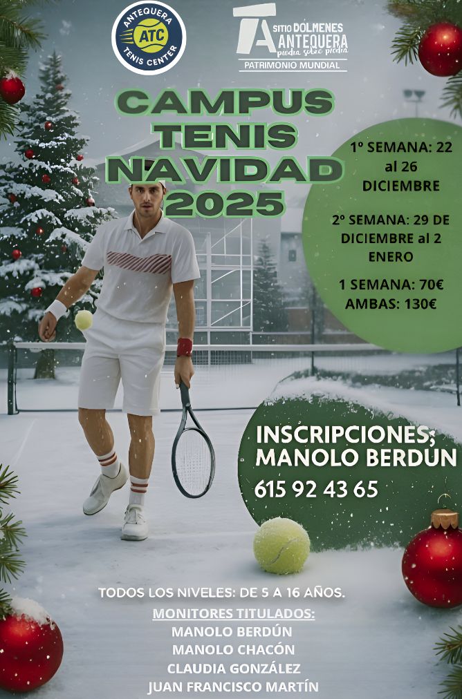 Campus dirigido por Antequera Tenis Center. Tendrá lugar del 22 de diciembre al 2 de enero. Para más información e inscripciones contactar con Manolo Berdún en el 615 92 43 65.