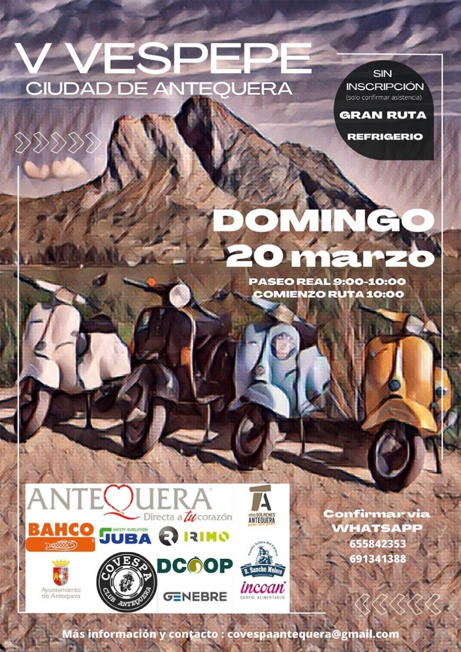 l teniente de alcalde delegado de Deportes, Juan Rosas, la teniente de alcalde de Turismo, Ana Cebrián, el tesorero del Club Covespa de Antequera, Ignacio Villalón, y el secretario Jesús Cantos han presentado en la mañana de hoy lunes la quinta edición del “Vespepe Ciudad de Antequera”, concentración de las célebres “Vespa” clásicas que se llevará a cabo el domingo 20 de marzo en torno a la festividad de San José y tras dos años sin poder celebrarse a consecuencia de la pandemia del coronavirus.